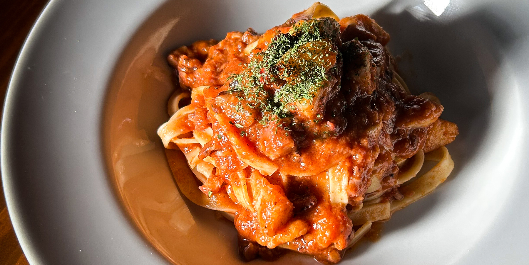 本日の旬製パスタは『フェットチーネ イイダコラグーと里芋のピリ辛トマトソース』になります。