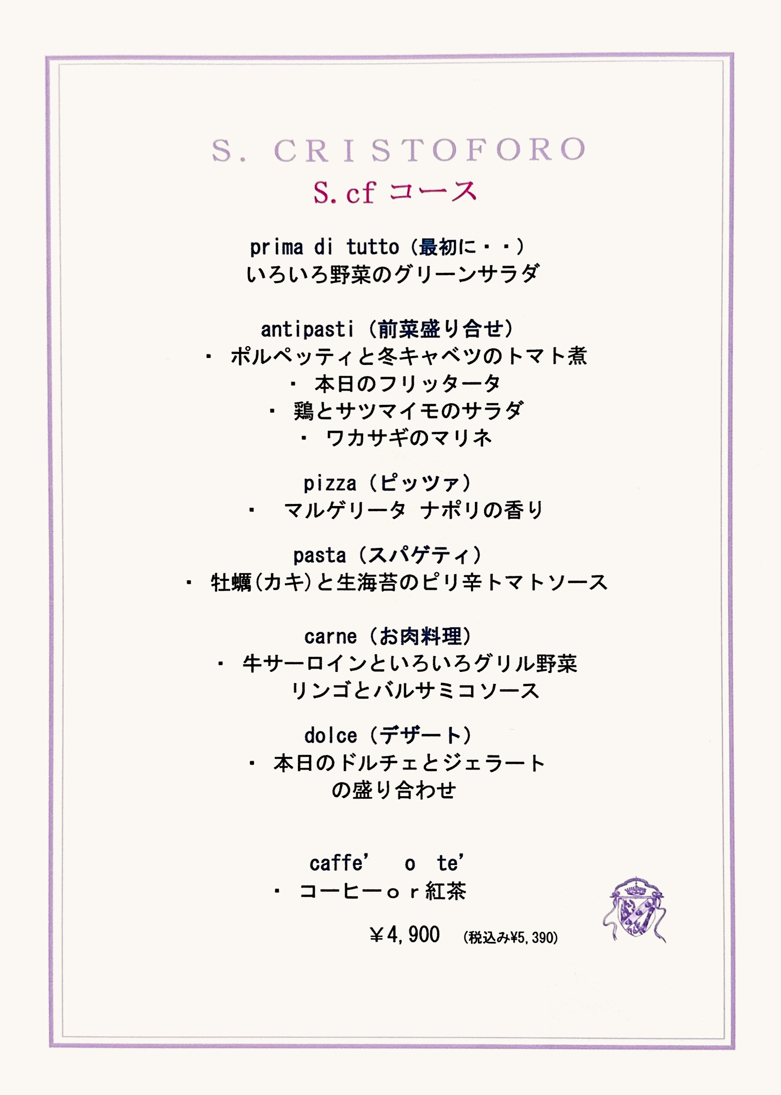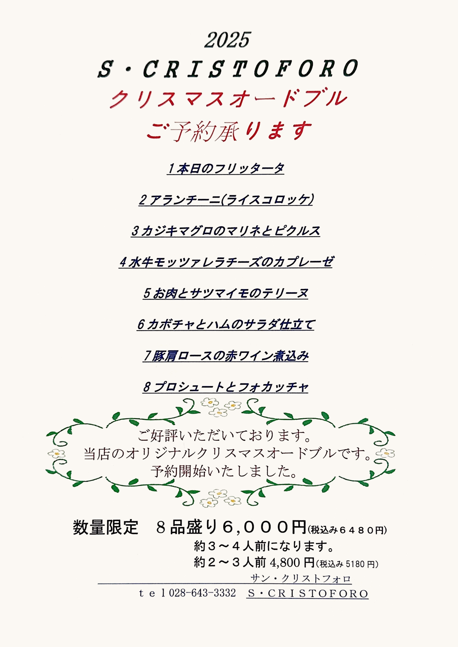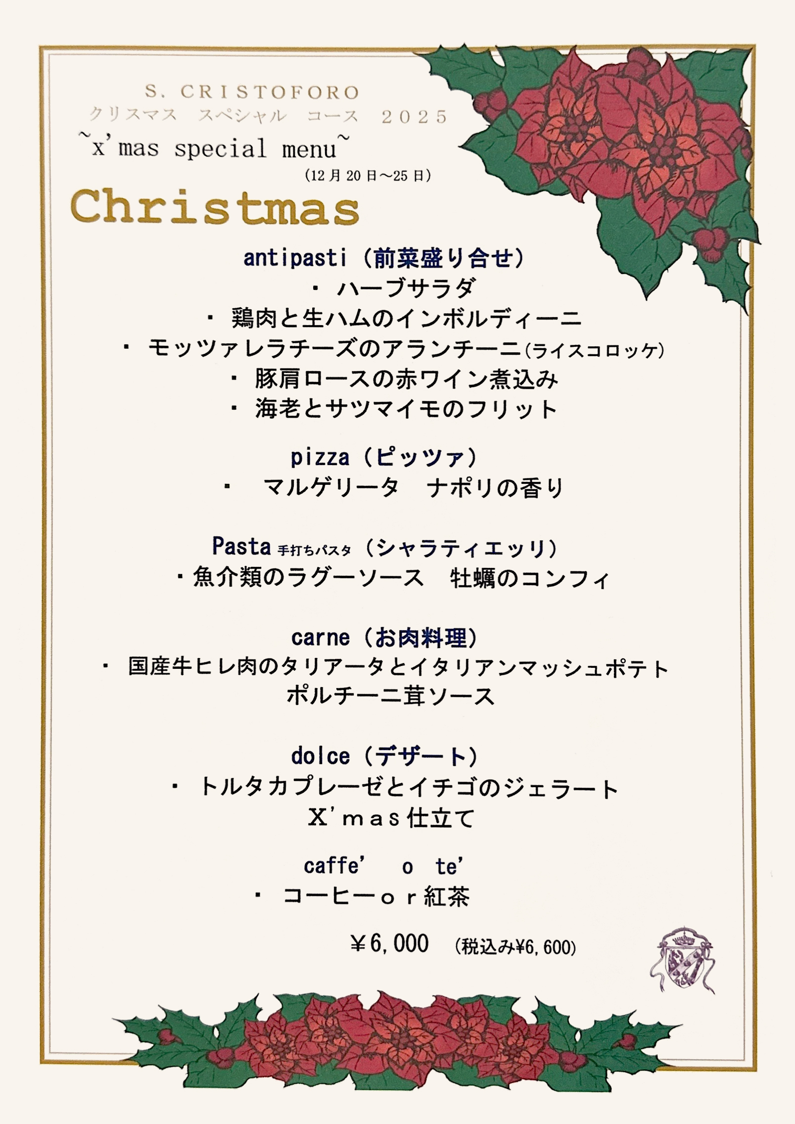 今年のクリスマスも、サンクリストフォロでは、“クリスマス・スペシャルコース2025”をご用意いたしております。皆様のご予約をお待ちしております。※期間内ディナータイムは本クリスマス・スペシャルコースとは別に、期間限定グランドメニューのご用意もしております。