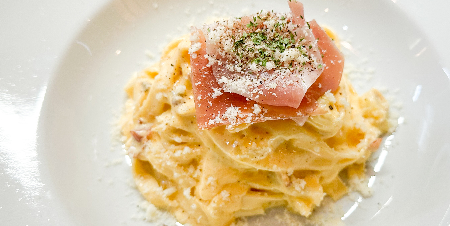 『フェットチーネ 生ハムとカリフラワーの名水卵カルボナーラ』です。