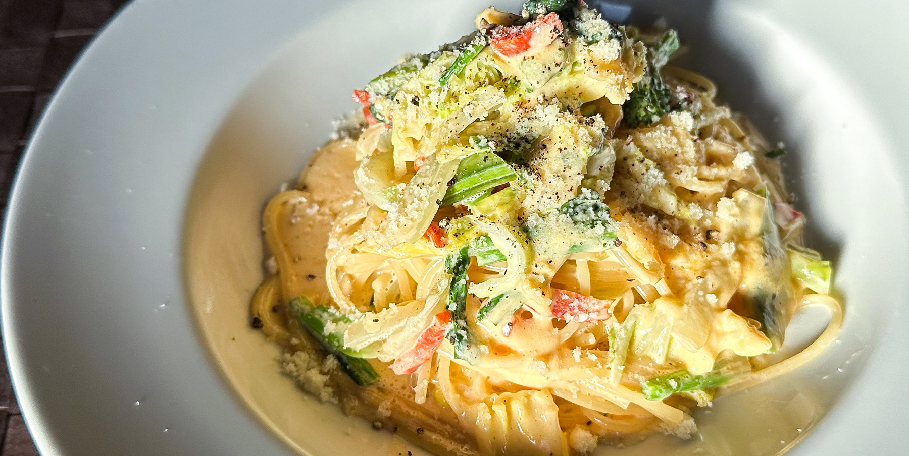 本日の旬製パスタは『スパゲティ 辛口サラミと冬野菜の名水卵カルボナーラ』になります。